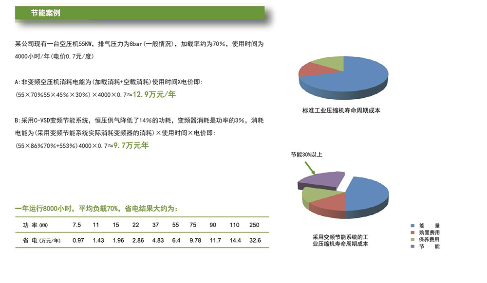 變頻節(jié)能系統(tǒng),是針對(duì)中低負(fù)載的壓縮機(jī)進(jìn)行變頻節(jié)能技術(shù)配置,以不改變?cè)邢到y(tǒng)為前提,對(duì)壓縮機(jī)變頻升級(jí),