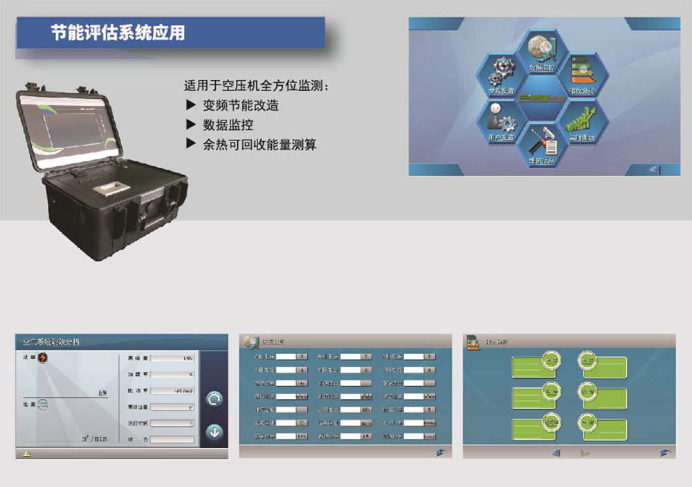 節能評估系統,該系統的檢測裝置可以對空壓機整機系統進行運行數據采集及節能空間的評估,對采集的數據進行計算機全方位深度分析,獲取現有壓縮機的加/卸載情況和壓縮空氣系統的全面信息,明確節能空間和節能潛力,幫助企業獲得更準確的節能依據以便于未來的投資決策。