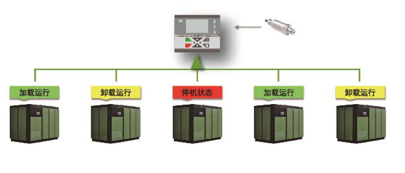 該系統能實現多臺空壓機無人值守連鎖控制(最多控制16臺) ;實現多臺機組順序啟停,輪流值守,主副機定時切換、變頻機組先起后停及對各機組運行參數進行監控與按需設置,從而達到提高工作效率、安全運行及充分節能的目的,并實現能量監控。