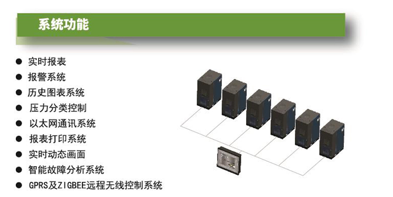 該系統可根據現場用氣量的需求合理分配每臺壓縮機的工作狀態,適應用氣的高峰、低峰,自動啟停壓縮機數量,合理分配每臺壓縮機工作時間,從而使壓縮機的運行時間和起動次數保持均衡。并 可根據需要通過RS485通訊接口連接- -個文本顯示或觸摸屏,可連接上位機(工控機或普通微機)進行遠程監控,您就可以在辦公室里實時控制空壓機的運行狀況,該系統還具備遠程